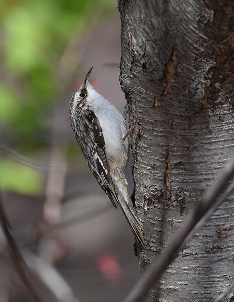 Another creeping bird, sometimes seen in mixed flocks and occasionally at seed and suet feeders, is the Brown Creeper (Certhia americana). The Brown Creeper is an uncommon species in Connecticut, since it prefers mature forests. It is a perfect example of an animal with cryptic coloration. Its mottled, brown color above blends perfectly with tree bark. When a bird feels threatened, it will freeze on the tree—it is really hard to see them!
