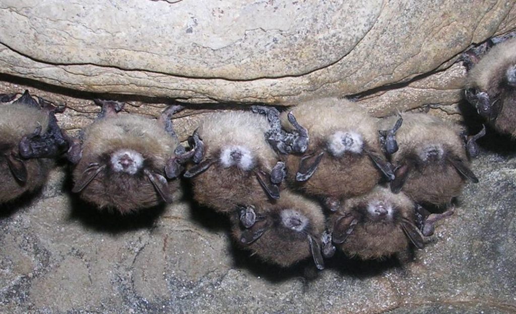 Hibernating Little Brown Bats suffering from White Nose Syndrome. The fungus Pseudogymnoascus destructans gives the disease White Nose Syndrome its name. Photo by New Hampshire Fish and Game.