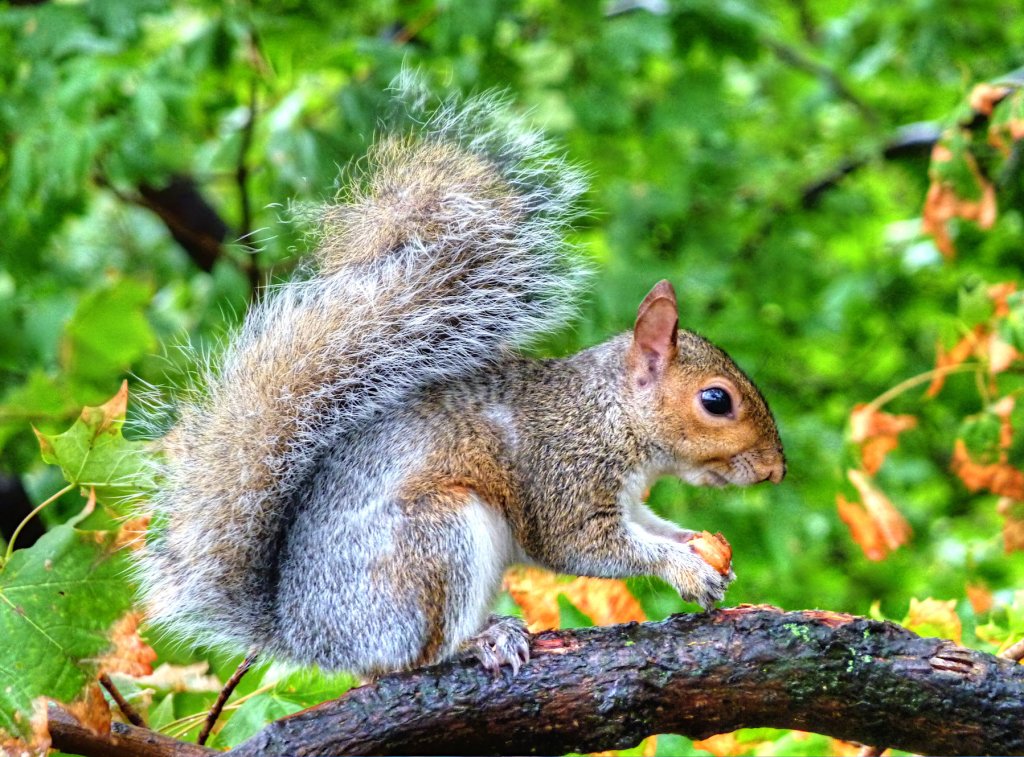 Gray squirrels bury acorns in different places, which is called scatter hoarding. It is thought that they use both their memory and landmarks to find their caches. When a squirrel grabs an acorn, it often does a quick head flick and turns the nut several times in its paws and mouth. These behaviors help the squirrel determine the nut’s freshness and weight, as lighter acorns are often infested with acorn weevils. But, as we know, squirrels don’t remember where all their acorns are, so we can thank them for planting new trees.